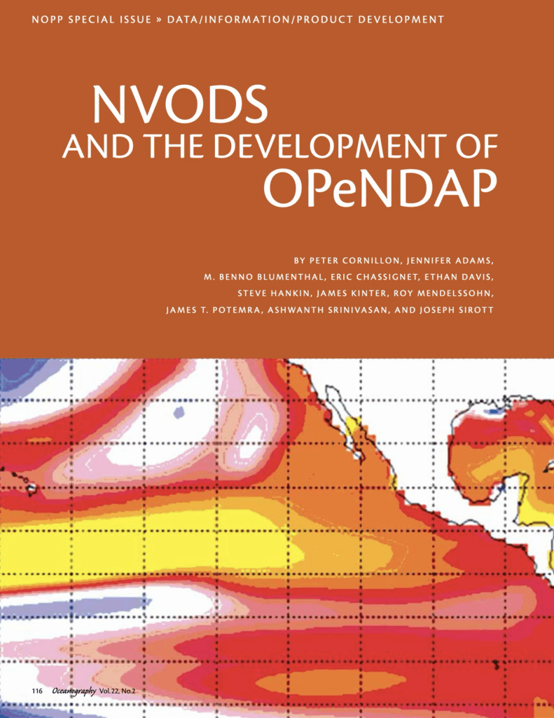 Cornillon, P., Adams, J., Blumenthal, M. B., Chassignet, E., Davis, E., Hankin, S., Kinter, J., Mendelssohn, R., Potemra, J., Srinivasan, A., & Sirott, J. (2009). NVODS and the Development of OPeNDAP. Oceanography, 22 (2), 116–127. https://doi.org/10.5670/oceanog.2009.43