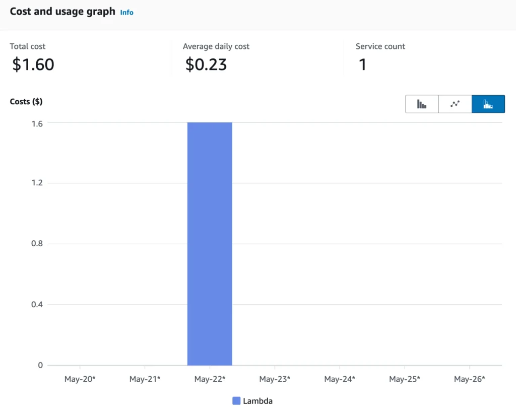 It’s shocking how cheap this is. Here is a screenshot of the AWS cost analyzer for Lambda for one run of a pipeline with 6643 chunks.