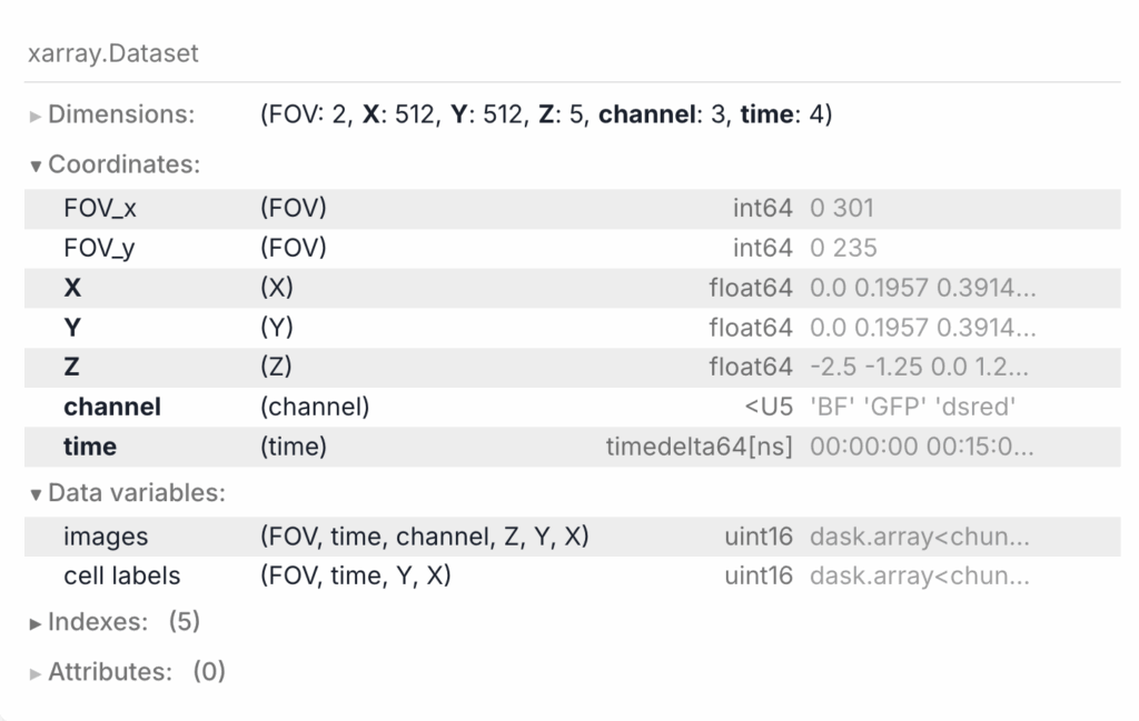 Happily, Xarray solves this problem for us as well! The Dataset object stores collections of related DataArray’s. For example, for our microscopy image stack, we might also create a segmentation layer that will share some of the dimensions of our image (time, X, Y, [Z]) but not all (channel, [Z]) and it would be great to keep them together.