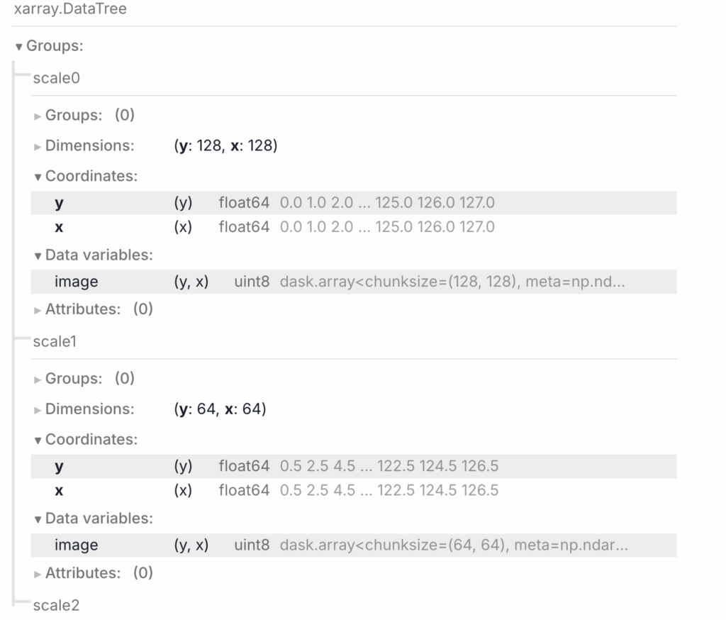 Finally, the DataTree object allows you to keep trees of related datasets, for example, a representation of multiscale images allows for natural support of OME-NGFF data.